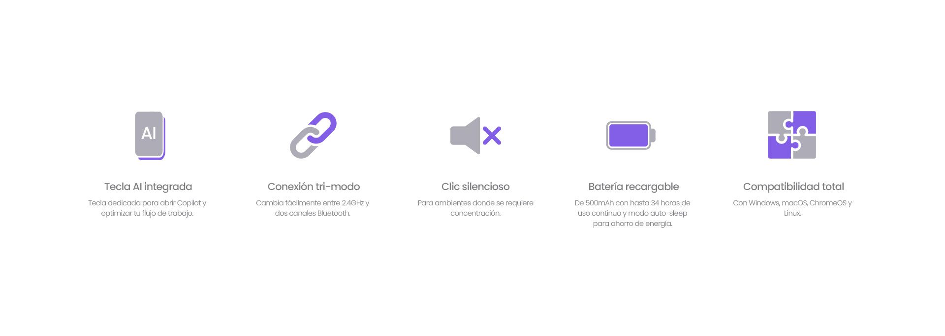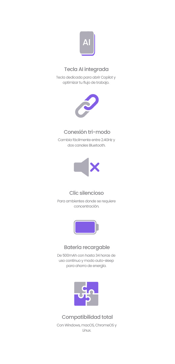 | Características adicionales | Modo triple: 2.4G + BT1 + BT2 Tecla de acceso rápido para Copilot AI Diseño de clic silencioso Modo de ahorro de energía con suspensión automática |