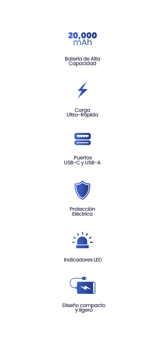 Integra sistemas de protección contra sobrevoltaje, sobrecorriente y cortocircuitos. Garantiza seguridad tanto para el power bank como para los dispositivos conectados, evitando daños por picos de energía.