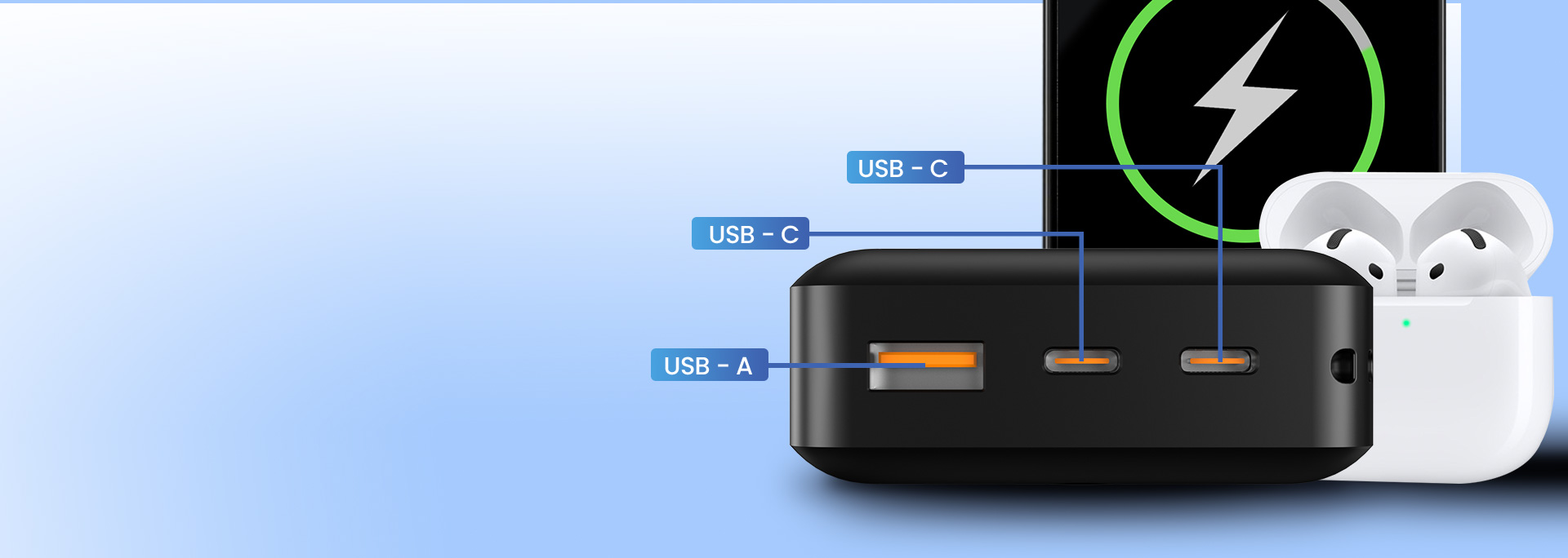 Incluye dos puertos USB-C y un puerto USB-A, ambos capaces de entregar energía eficiente y estable. Permite cargar dos dispositivos al mismo tiempo sin pérdida de velocidad, optimizando tu tiempo y recursos.