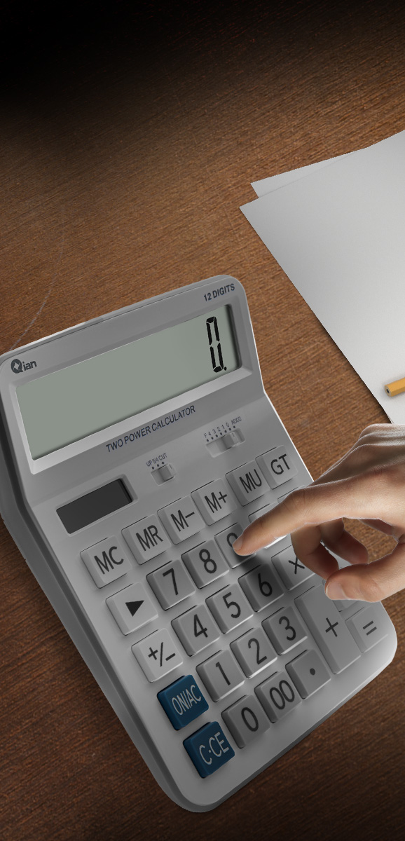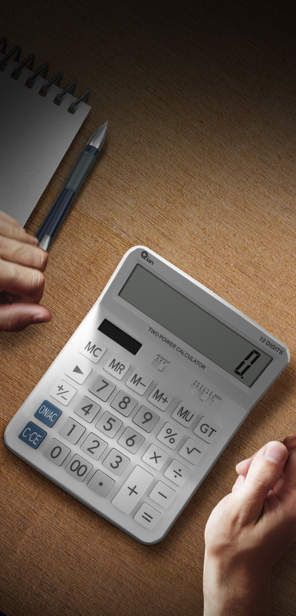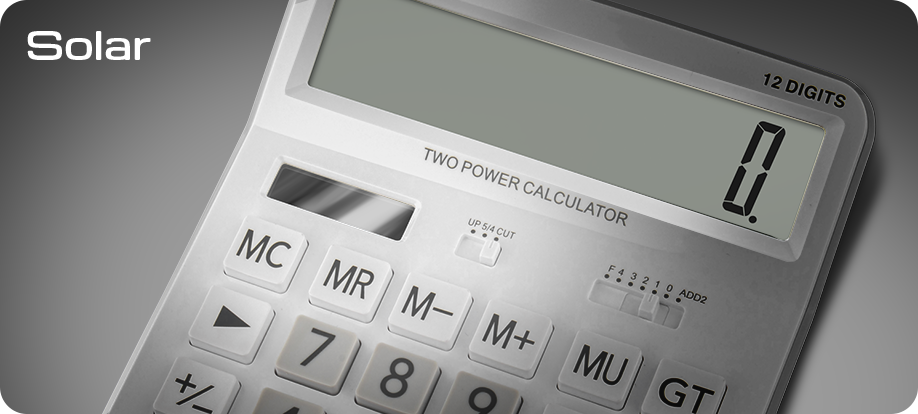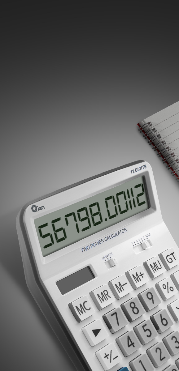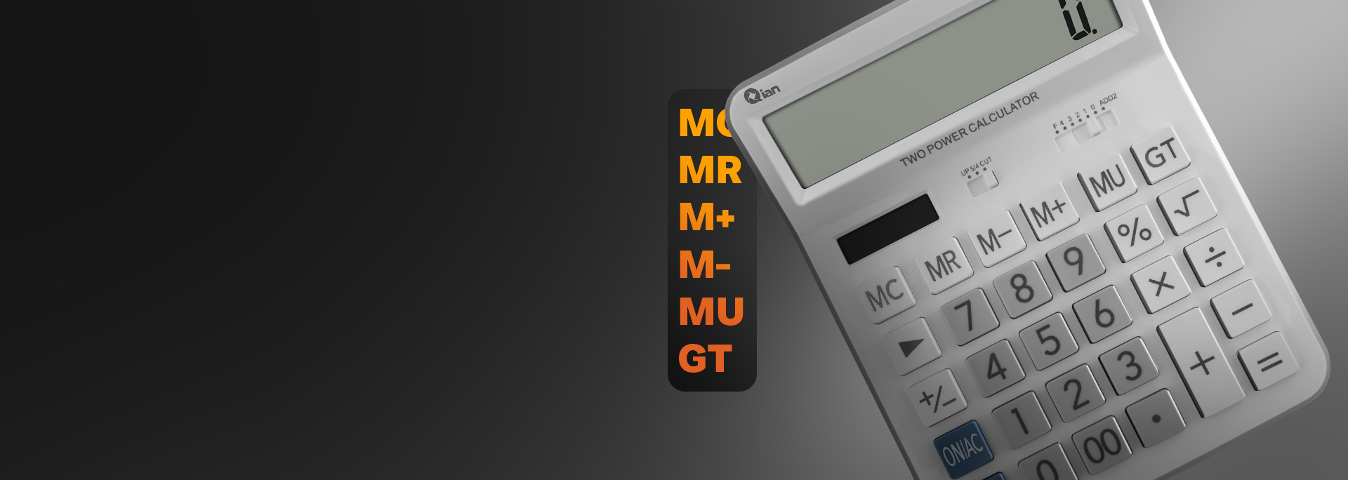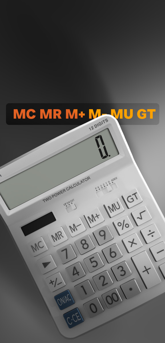 Incluye teclas de memoria (MC, MR, M+, M-), función de margen (MU), total general (GT), redondeo y selector de decimales — pensadas para tareas contables y de oficina.