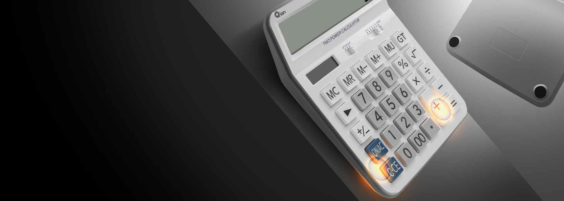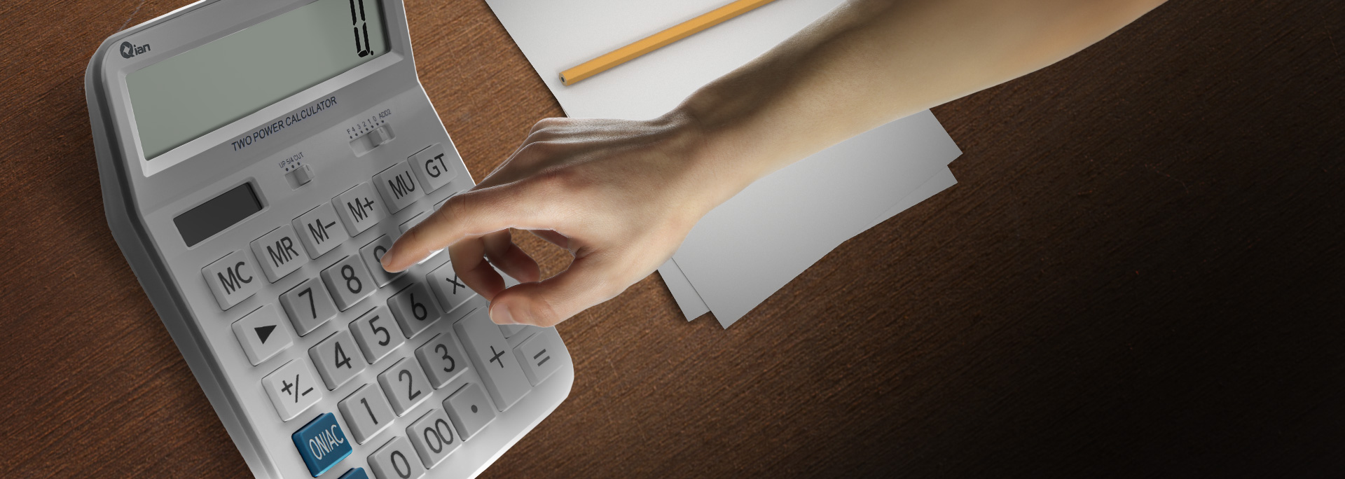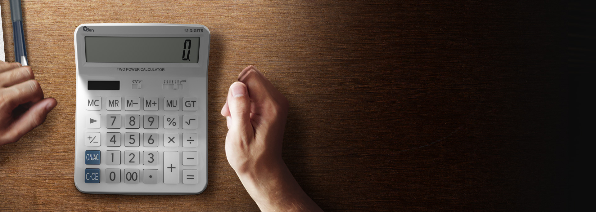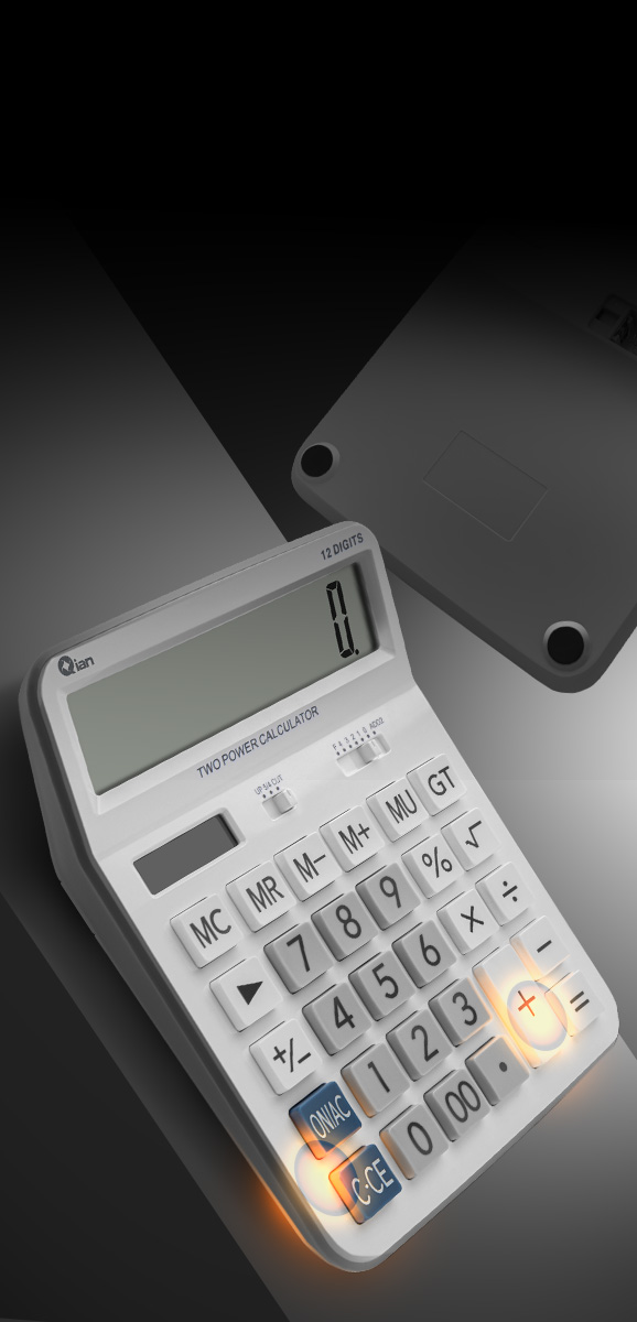 Incluye teclas de memoria (MC, MR, M+, M-), función de margen (MU), total general (GT), redondeo y selector de decimales — pensadas para tareas contables y de oficina.