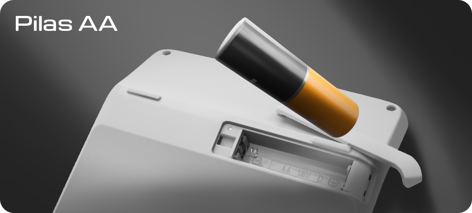 Funciona con luz ambiental gracias a su panel solar y cuenta con una pila AA como respaldo, asegurando un rendimiento ininterrumpido en cualquier entorno.