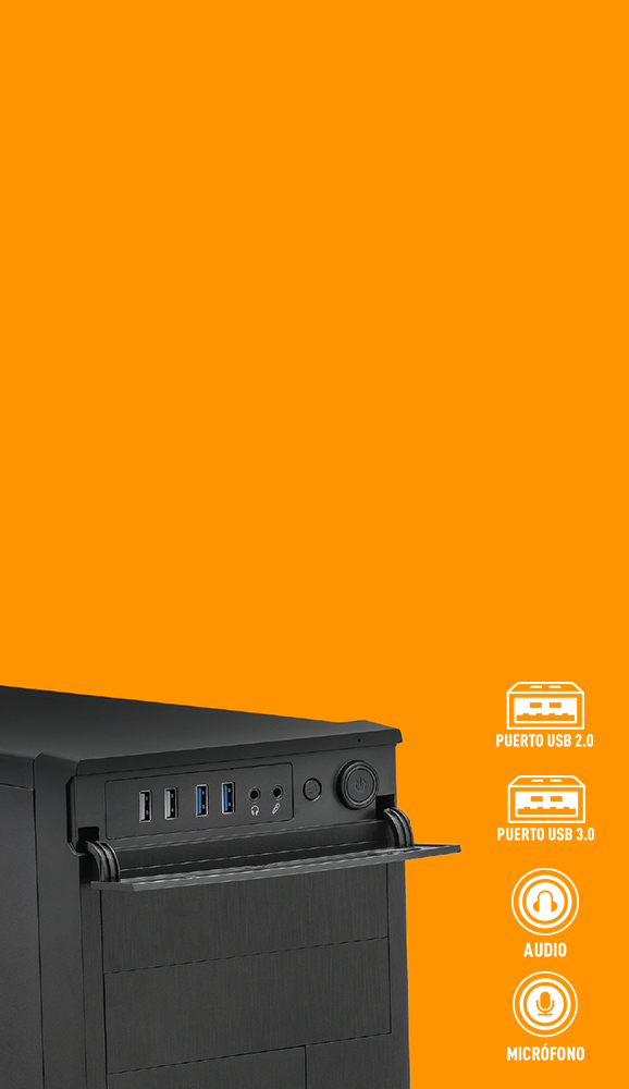 Cuenta con HD Audio, USB 2.0 (x2) y USB 3.0 (x2) como puertos frontales para transferencias de datos ultrarrápidas.