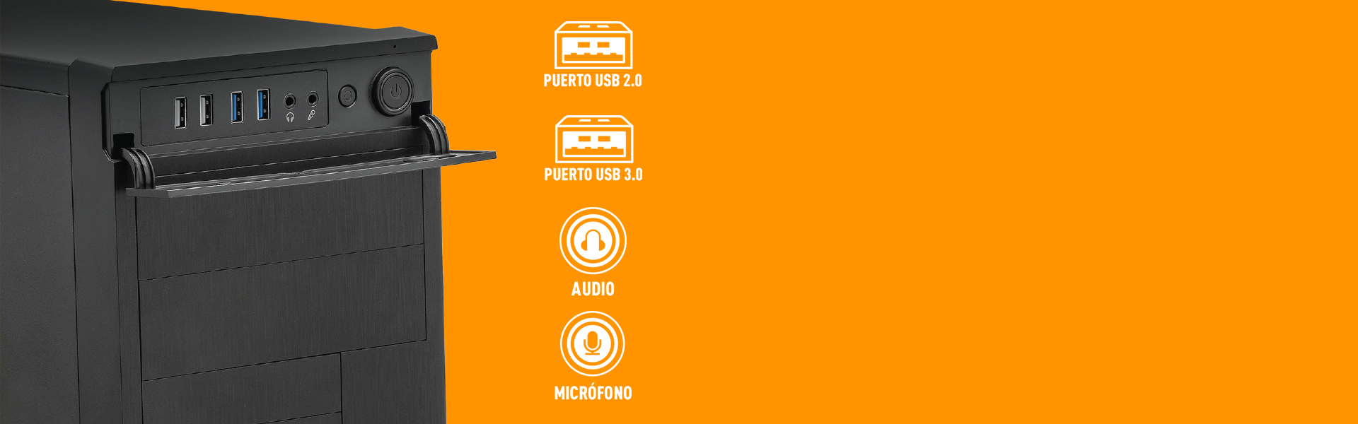[Gabinete] USB: 2 x 3.2 Gen 1, 2 x 2.0, Micrófono y Audífonos + [Panel Trasero] USB: 2 x 3.2 Gen 1, 2 x 2.0, 1 x DisplayPort, 1 x HDMI, 1 x D-Sub, 1 x Ethernet, 3 x Audio jacks, 1 x PS/2 Teclado (morado), 1 x PS/2 Mouse (verde)